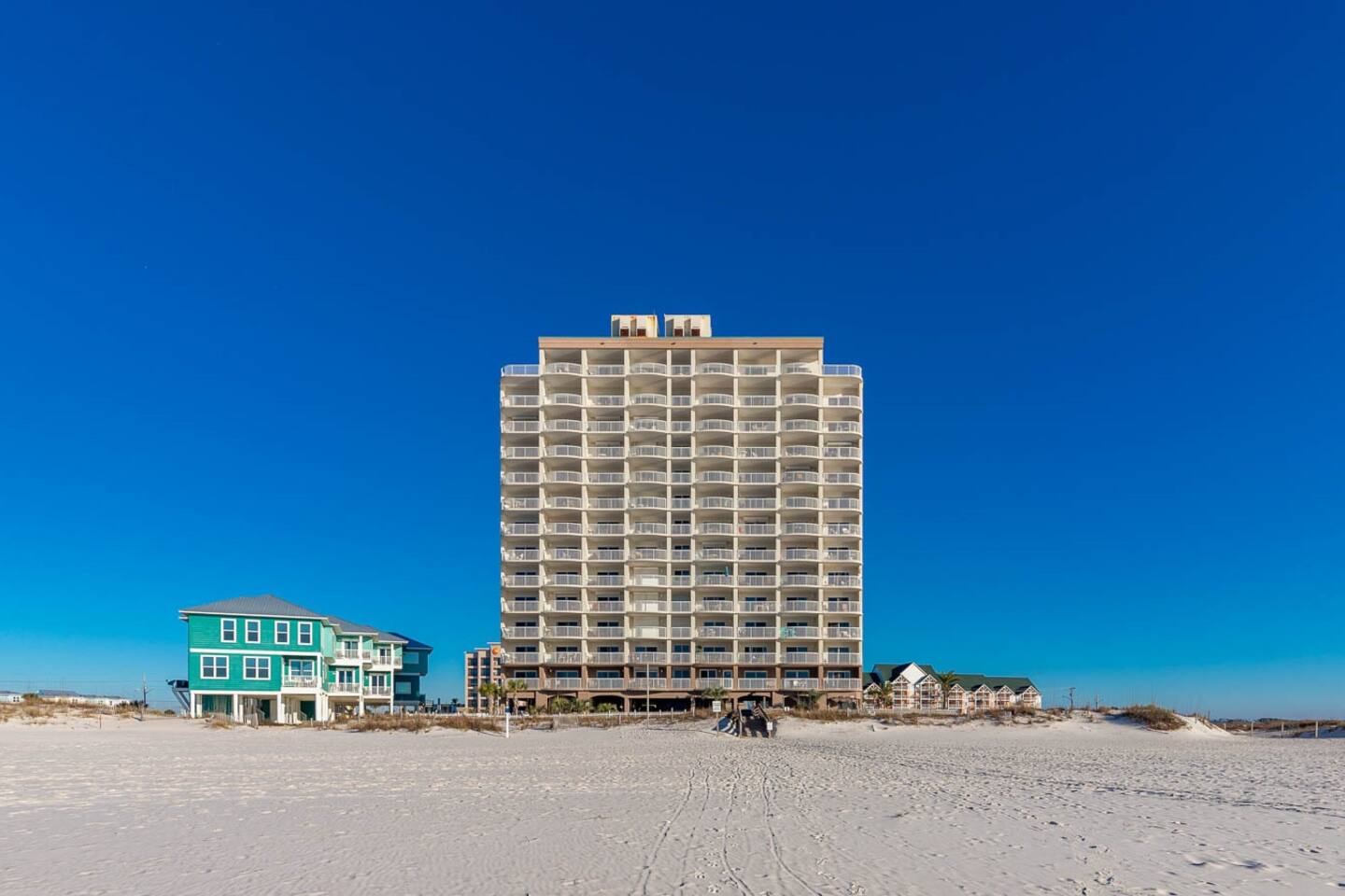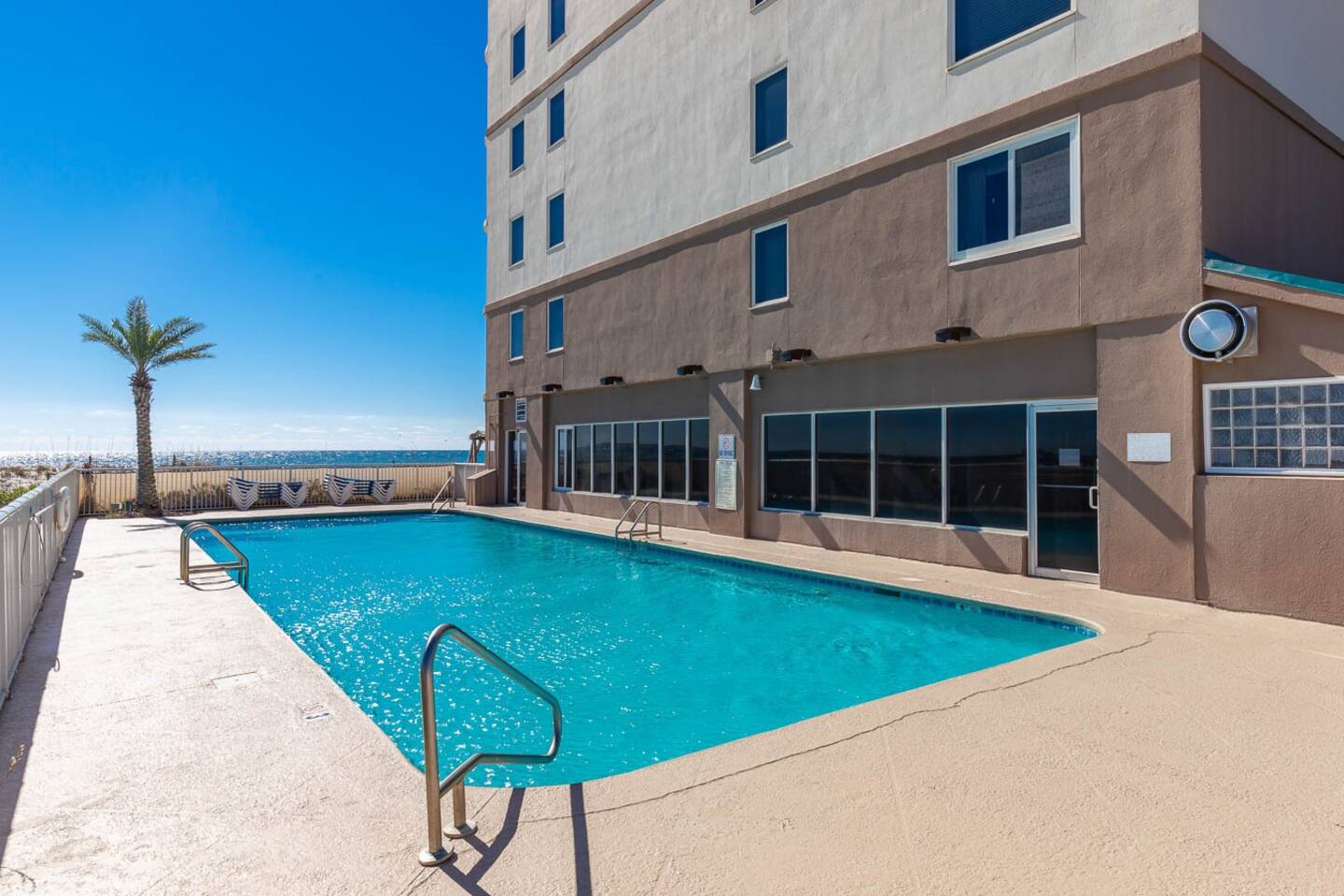 Relax at this Gulf-front condo with king bed, private beach, outdoor pool, hot tub, and sauna. Royal Palms is minutes from attractions like the Alabama Gulf Coast Zoo, Gulf State Park Pier, golf, and dining. Start your day with coffee on the balcony and stunning ocean views. After exploring or lounging by the pool, unwind with cable TV in the cozy living area. Cook meals in the well-equipped kitchen, dine or play games together, and rest in tranquil bedrooms for another day of adventure.
